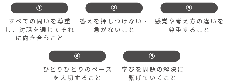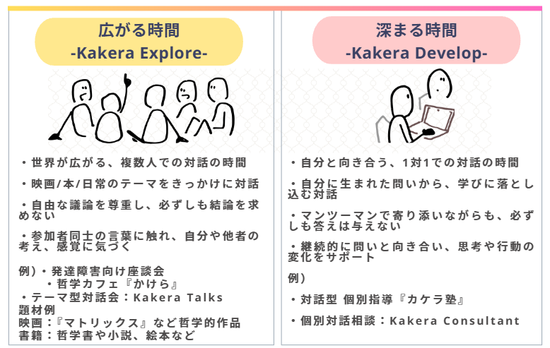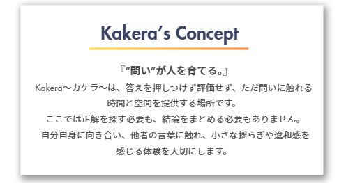 Kakera~カケラ~では、結論を急がず、評価や正解に縛られない環境の中で、対話を通じて、問いを持ち、考え続ける力を育てます。