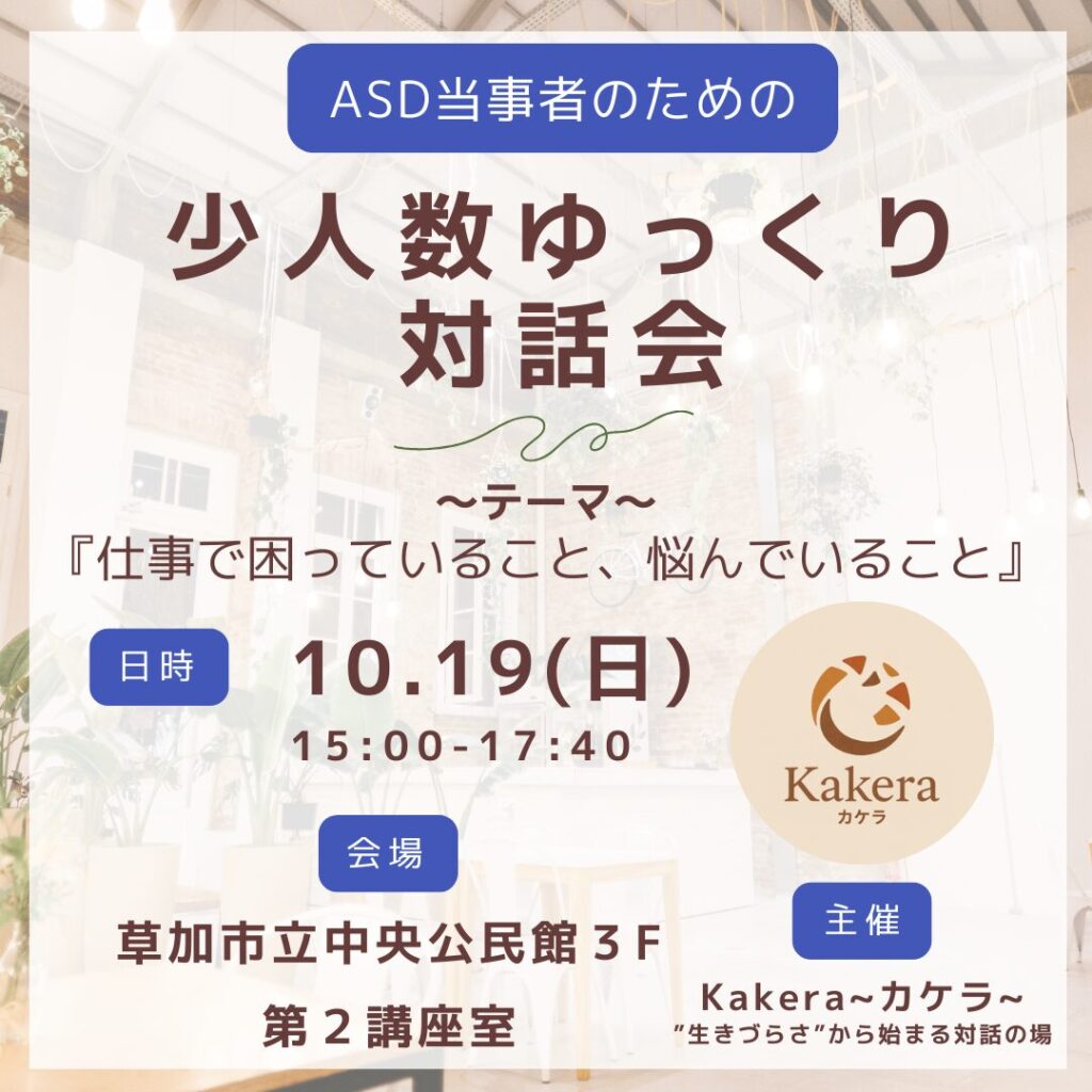 直近では、『ASD当事者のための”少人数ゆっくり対話会”』を10/19(日)に開催予定です。ぜひ皆さまのお申込みをお待ちしております…!
