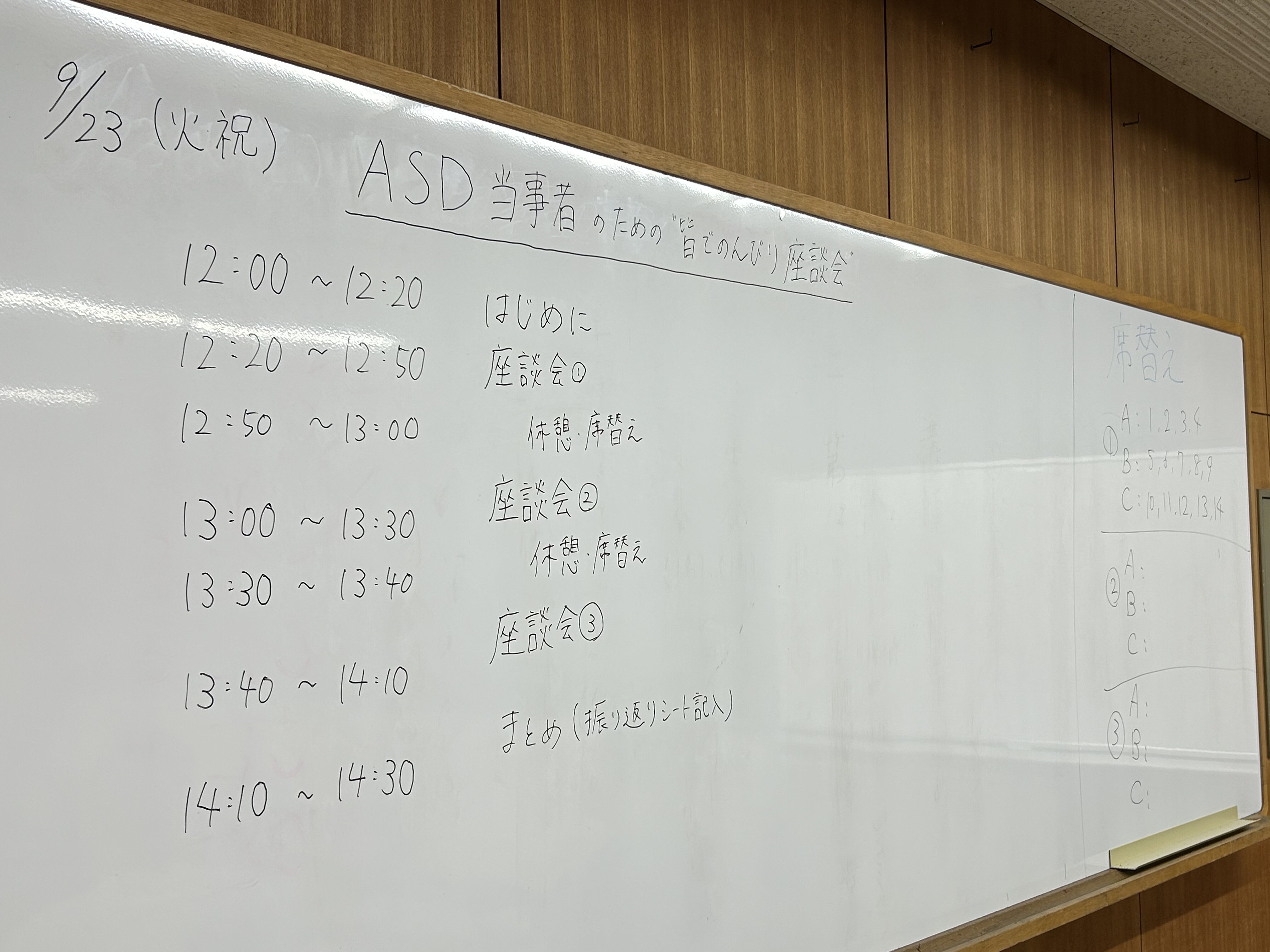 9/23(祝日)、草加市立中央公民館にて、ASD当事者や支援者の方を対象にした座談会を開催しました。